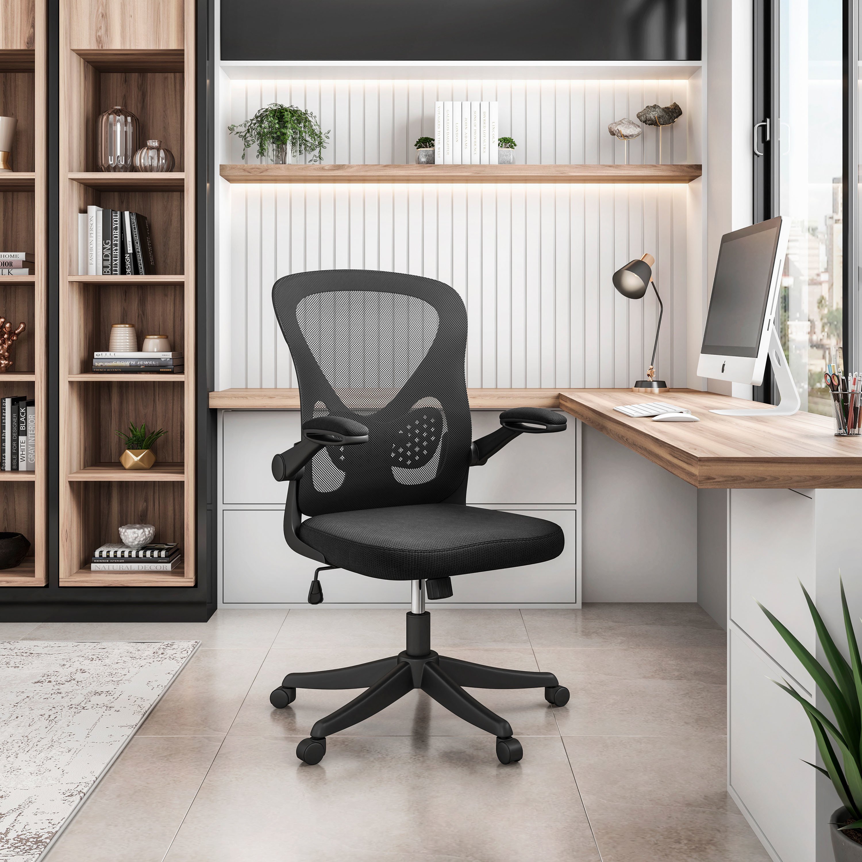 Techni Mobili Black Mesh Office Chair with Lumbar Support and Flip-Up Arms